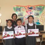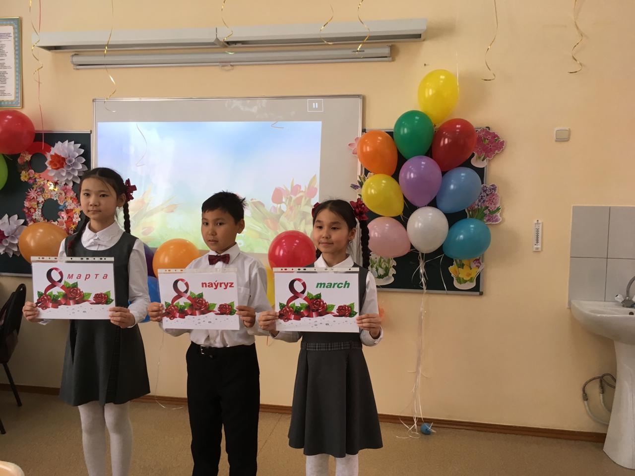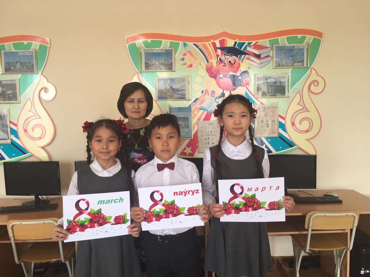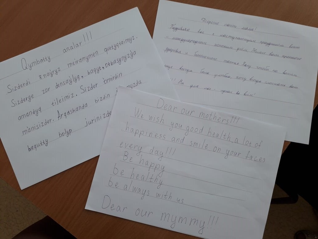 Ағылшын тілі әдістемелік бірлестігінің жетекшілігімен мерекеге арналған ертеңгіліктерде уш тілде құттықтау дәстүрге айналған. Биылғы жылы да 4 «А» сынып оқушылыры Аналар мейрамына арналған ертеңгілікте үш тілде жылы лебіздерін білдіріп, қазақ тілінде латын әліпбиін қолдана отырып жазды.