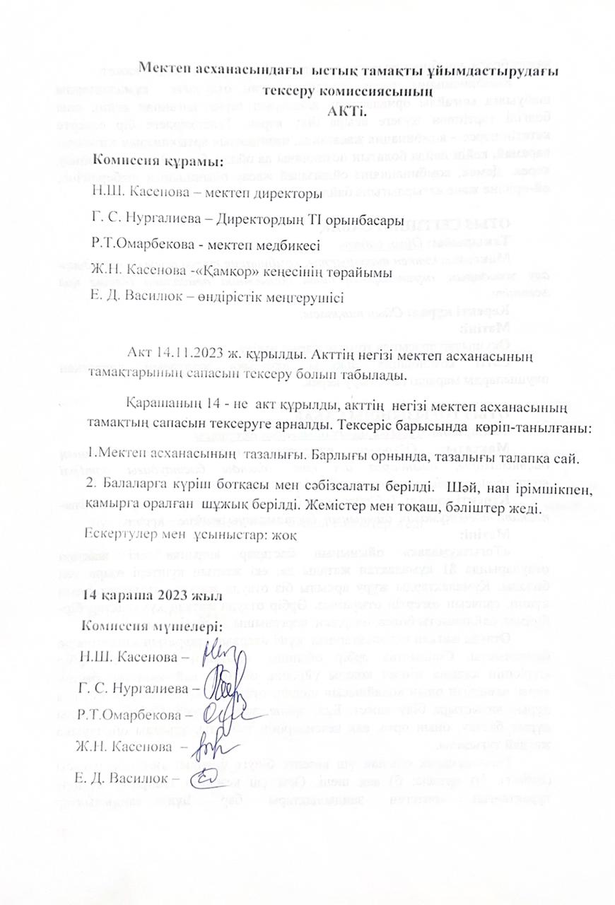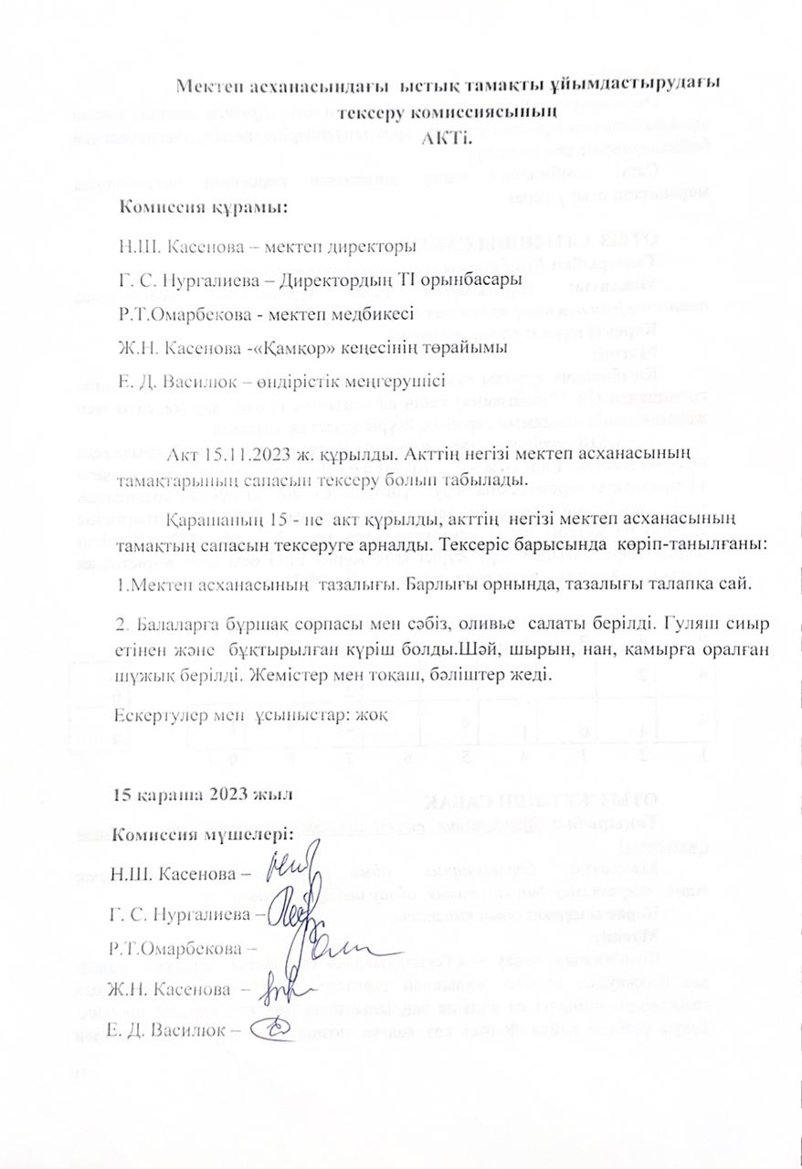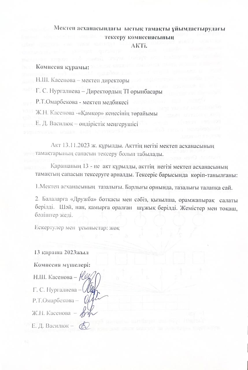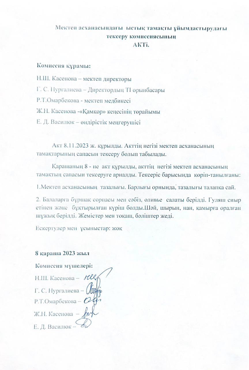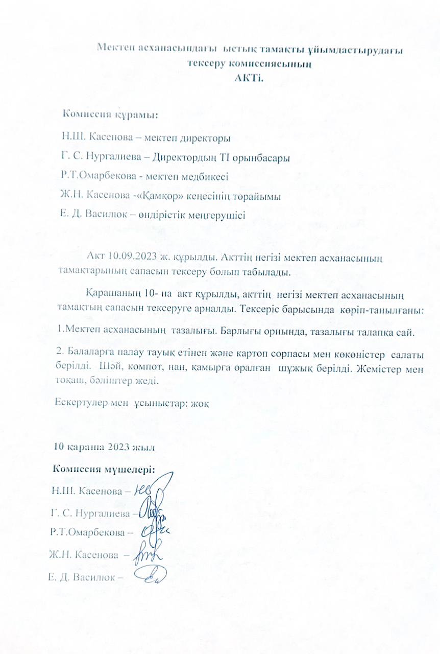 • Мектеп асханасындағы ыстық тамақты ұйымдастырудағы тексеру комиссиясының актілері