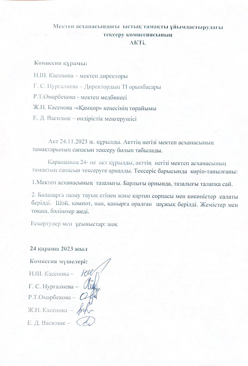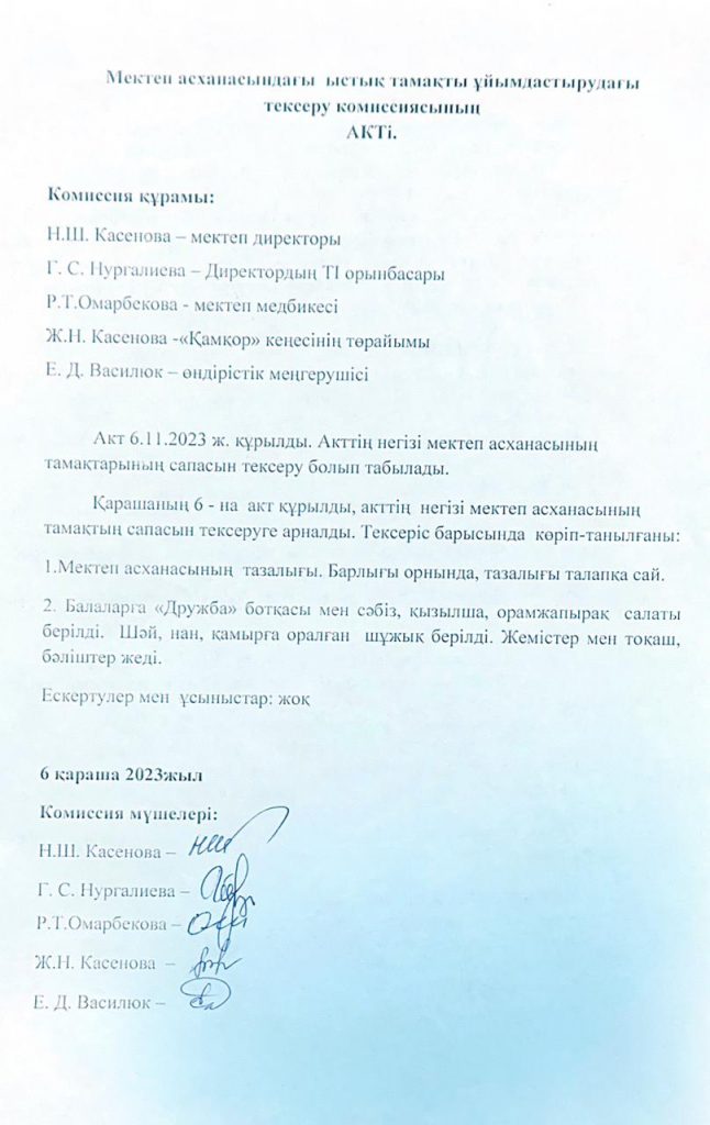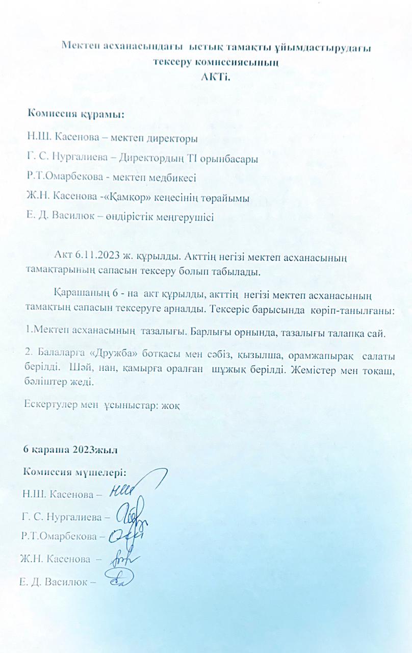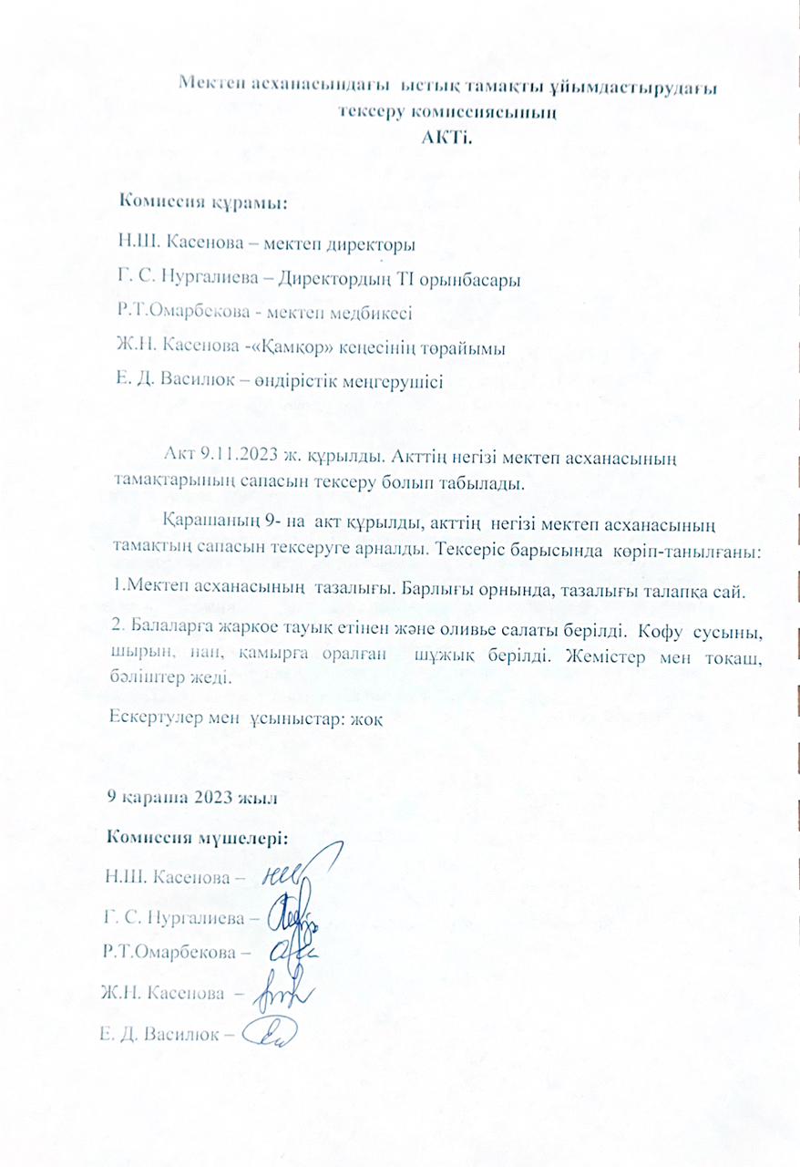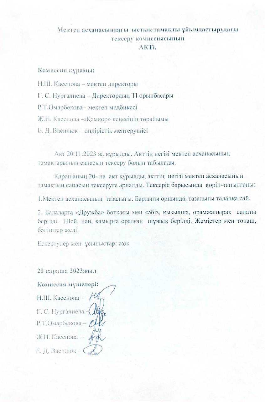 • Мектеп асханасындағы ыстық тамақты ұйымдастырудағы тексеру комиссиясының актілері