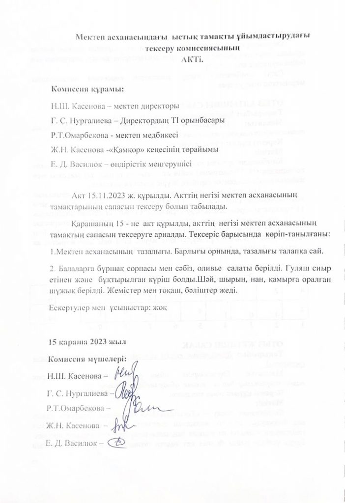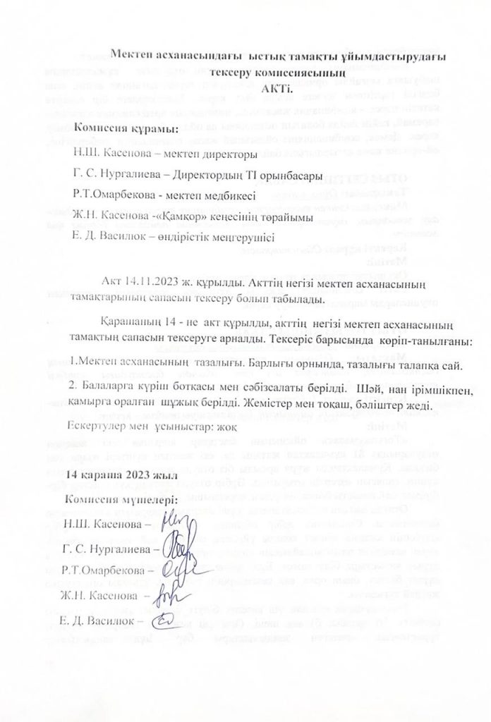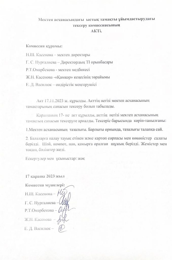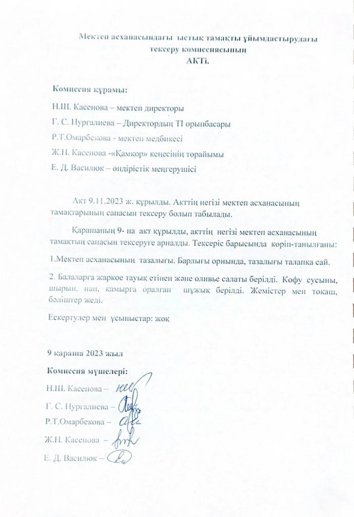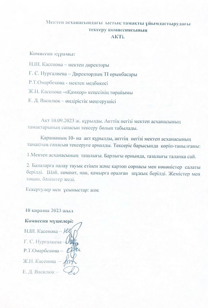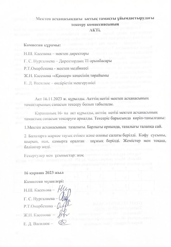 • Мектеп асханасындағы ыстық тамақты ұйымдастырудағы тексеру комиссиясының Актісі