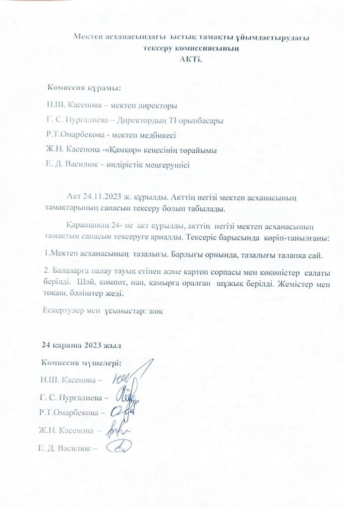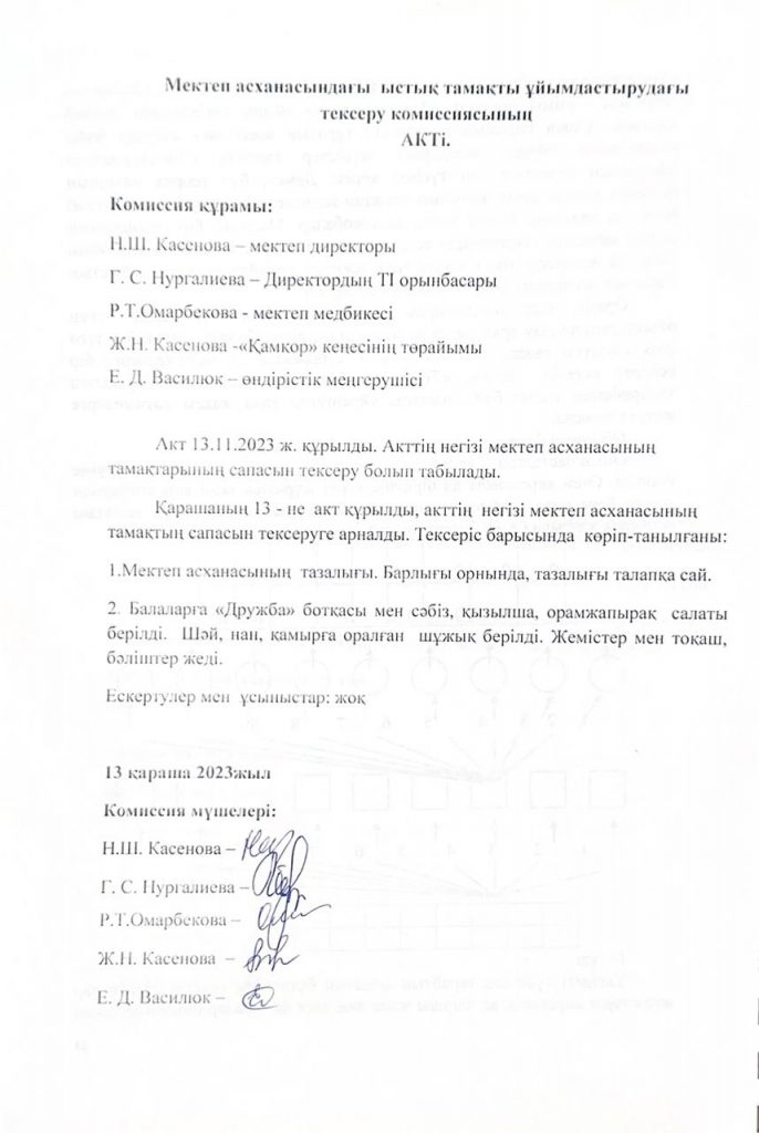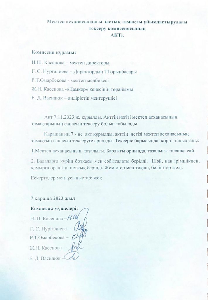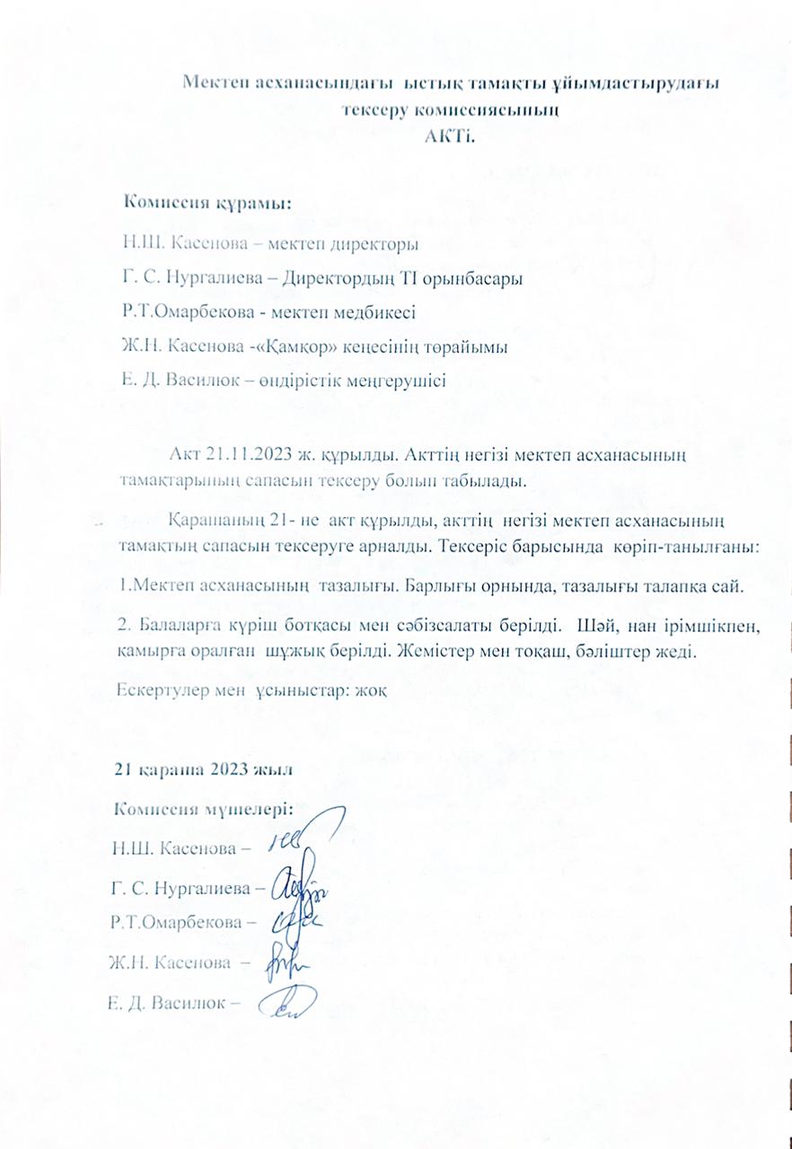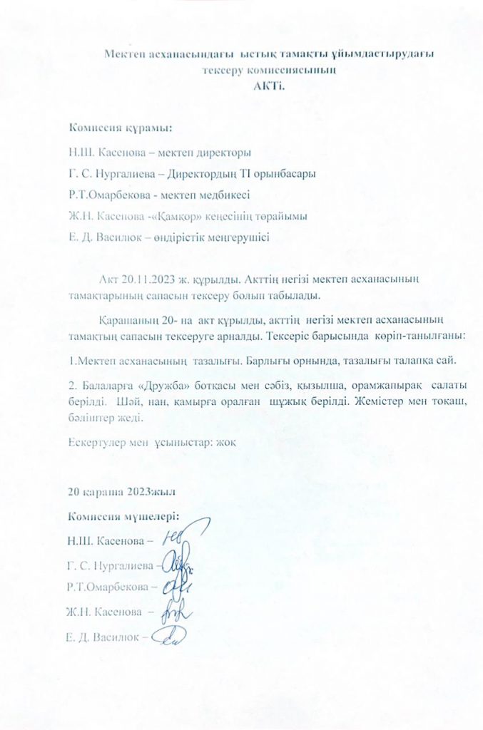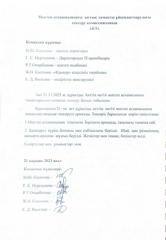 • Мектеп асханасындағы ыстық тамақты ұйымдастырудағы тексеру комиссиясының Актісі