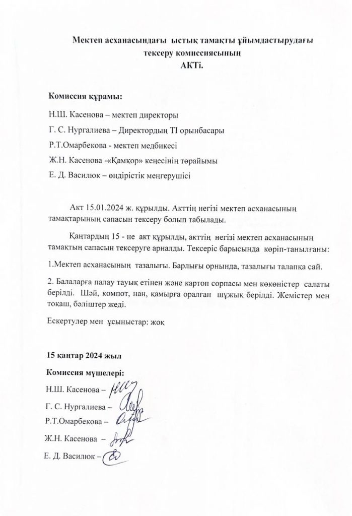 • Мектеп асханасындағы ыстық тамақты ұйымдастырудағы тексеру комиссиясының Актісі