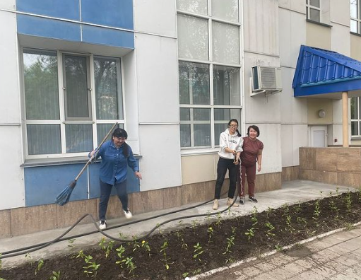 2 «А» сыныбының ата-аналары есік алдына гүлдер отырғызды