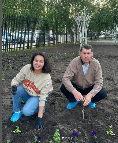 1 “Б” сынып ата-аналарының мектеп ауласына гүл егу сәтінен үзінді