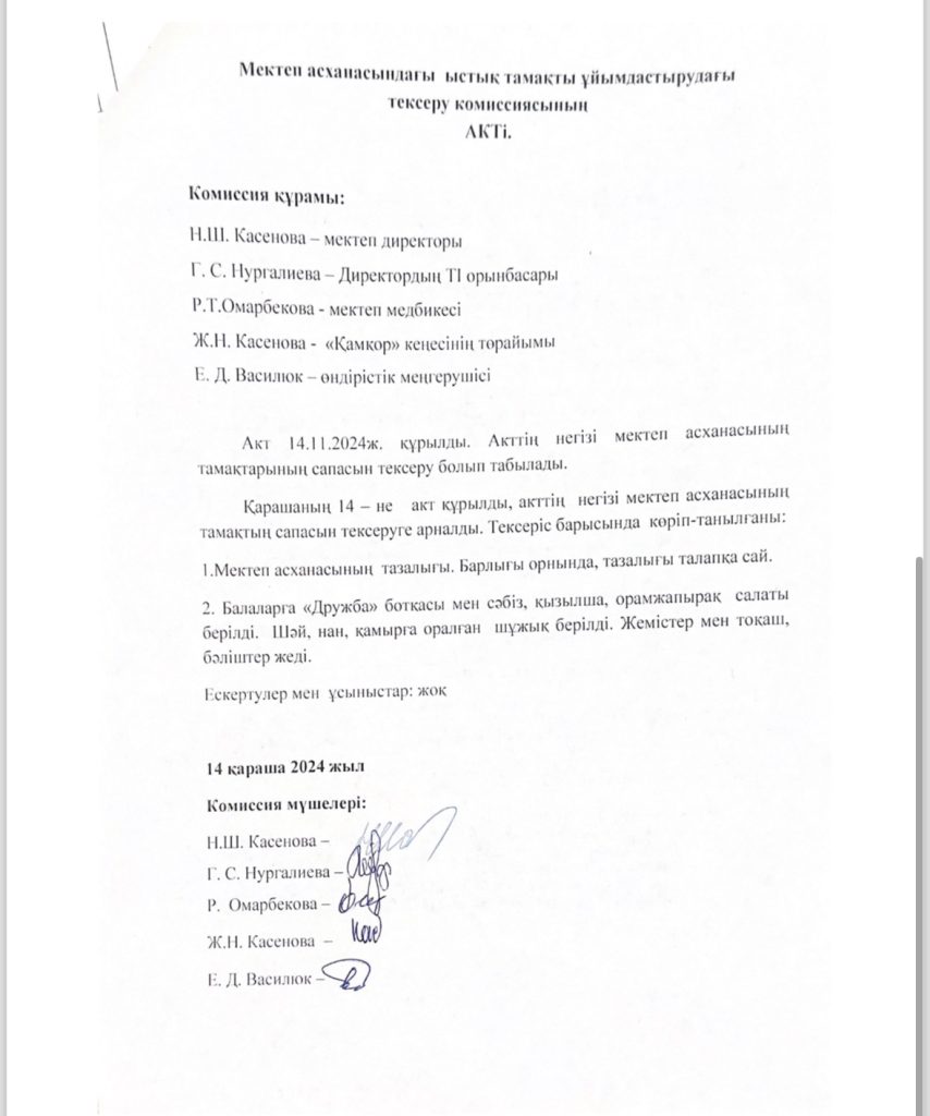 • Мектеп асханасындағы ыстық тамақты ұйымдастырудағы тексеру комиссиясының Актісі
